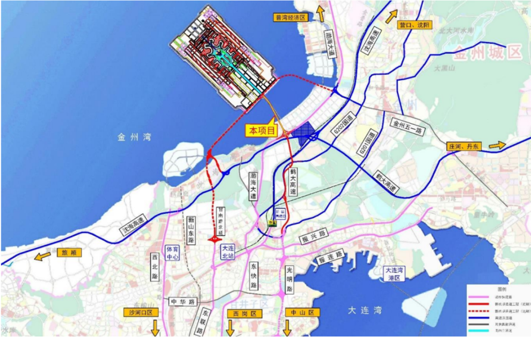 大連金州灣國(guó)際機(jī)場(chǎng)是為打造東北亞國(guó)際航空樞紐、服務(wù)環(huán)渤海經(jīng)濟(jì)圈與日韓俄貿(mào)易通道而建造的離岸人工島機(jī)場(chǎng),也是世界較大的離岸式“人工島”機(jī)場(chǎng),總投資約2630億元,被列入國(guó)家“十四五”的重大交通工程。跨海大橋項(xiàng)目位于大連市甘井子區(qū)與金州區(qū)交界處,為大連新機(jī)場(chǎng)中線主通道跨海段,是大連新機(jī)場(chǎng)對(duì)外聯(lián)系的主要通道。