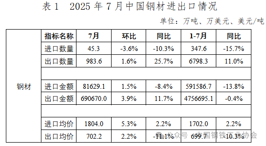 2025年7月,我國出口鋼材983.6萬噸,較上月小幅回升1.6%,出口規(guī)模保持相對穩(wěn)定,出口均價702.2美元/噸,較上月小幅上漲2.2%。1-7月,我國累計出口鋼材6798.3萬噸,同比增長11.0%,出口均價699.7美元/噸,同比下跌10.3%。7月,我國進(jìn)口鋼材45.3萬噸,環(huán)比下降3.6%,降幅較上月進(jìn)一步擴(kuò)大,進(jìn)口均價1804.0美元/噸,環(huán)比上漲5.3%。1-7月,我國累計進(jìn)口鋼材347.6萬噸,同比下降15.7%,進(jìn)口均價1702.0美元/噸,同比上漲2.2%。