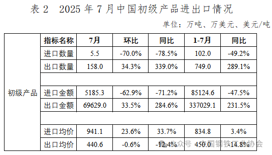 2025年7月,我國出口初級產(chǎn)品(鋼坯、生鐵、直接還原鐵及再生鋼鐵原料)158.0萬噸,環(huán)比增長34.3%;出口均價440.6美元/噸,環(huán)比基本持平。1-7月,我國累計出口初級產(chǎn)品749.0萬噸,同比增長2.9倍;出口均價450.0美元/噸,同比下跌14.8%,降幅較1-6月小幅收窄。7月,我國進(jìn)口初級產(chǎn)品5.5萬噸,環(huán)比大幅下降70.0%;進(jìn)口均價941.1美元/噸,環(huán)比增長23.6%。1-7月,我國累計進(jìn)口初級產(chǎn)品102.0萬噸,同比下降49.2%;進(jìn)口均價834.8美元/噸,同比上漲3.4%。進(jìn)出相抵,1-7月我國折合粗鋼凈出口7384萬噸,較上年同期增加1424萬噸,同比增長23.9%。