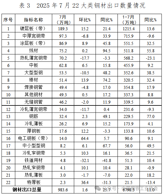2025年7月,我國鋼材主要品種出口量環(huán)比增減不一。出口前5位的品種并未出現(xiàn)調(diào)整,合計出口占比也保持穩(wěn)定,但分品種出口量則呈現(xiàn)不同變化趨勢。