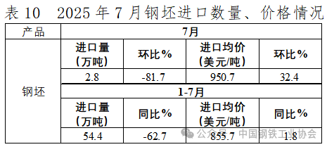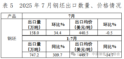 7月,鋼坯出口量環(huán)比再度大幅增長,出口單價與上月基本持平,1-7月累計出口已接近750萬噸,出口單價同比降幅收窄。