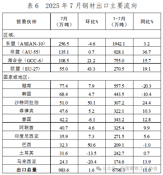 7月,我國對東盟出口鋼材規(guī)模持續(xù)下降,但降幅收窄;對海合會國家和歐盟出口規(guī)模環(huán)比明顯增長。分國別來看,對越南、韓國及巴西的出口環(huán)比止跌回升,對其他拉丁美洲和東南亞主要國家的出口環(huán)比則出現(xiàn)不同程度下降。