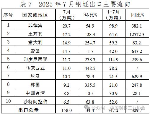 7月,我國鋼坯出口環(huán)比增長,向菲律賓、意大利、印度尼西亞、馬來西亞等國家出口環(huán)比持續(xù)大幅增長,向土耳其出口環(huán)比降幅近30%。