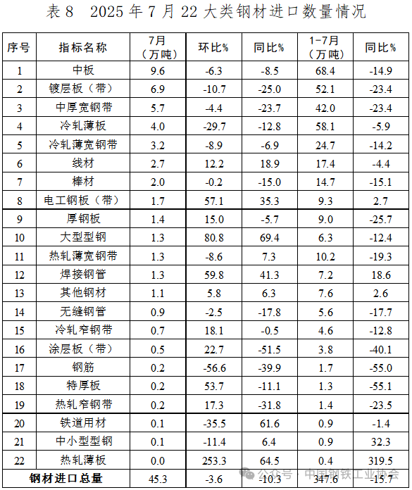 2025年7月,我國鋼材進(jìn)口規(guī)模持續(xù)萎縮,為近10年以來單月進(jìn)口量最低水平。各主要品種進(jìn)口量環(huán)比大多下降,進(jìn)口前5位的品種占當(dāng)月我國鋼材進(jìn)口總量的比重較上月有所下降。7月,我國鋼材的主要進(jìn)口來源及結(jié)構(gòu)仍保持穩(wěn)定,除自中國臺灣進(jìn)口鋼材環(huán)比回升外,自其它主要國家進(jìn)口鋼材數(shù)量環(huán)比均下降,且降幅大于總體水平。
