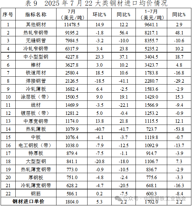 7月,22大類鋼材品種中,有8類品種出口量環(huán)比下降,減量主要來自熱軋板卷產(chǎn)品。其中,熱軋薄寬鋼帶、大型型鋼、冷軋薄寬鋼帶和鐵道用材等4個品種出口量環(huán)比降幅超過10%,中厚寬鋼帶、焊接鋼管、無縫鋼管及熱軋薄板等品種出口量環(huán)比也出現(xiàn)一定程度下降。其余14類品種出口量環(huán)比出現(xiàn)增長,增量主要來自鍍層板(帶)、涂層板(帶)和棒材。1-7月,鍍層板(帶)是累計出口量最大的品種,占鋼材出口總量的17.9%;熱軋板卷產(chǎn)品累計出口量同比繼續(xù)呈下降態(tài)勢,但中厚寬鋼帶和熱軋薄寬鋼帶兩個主要品種累計出口量同比降幅小幅收窄;線材和棒材累計出口量同比持續(xù)擴(kuò)大。7月,多數(shù)品種出口單價保持在較穩(wěn)定區(qū)間,電工鋼板(帶)出口單價環(huán)比跌幅最為明顯,為13.6%;厚鋼板出口單價環(huán)比漲幅最大,為11.0%。1-7月,電工鋼板(帶)和熱軋窄鋼帶2個品種出口單價同比已實現(xiàn)正增長,另有冷軋窄鋼帶等部分品種出口單價降幅同比收窄。
