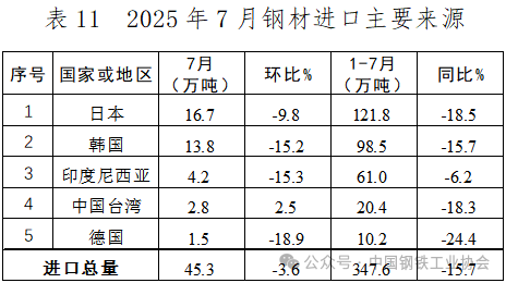 7月,我國鋼材進(jìn)口結(jié)構(gòu)總體保持穩(wěn)定,鋼材進(jìn)口規(guī)模雖持續(xù)減少,但環(huán)比降幅也在同步收窄。分國別來看,自日本、韓國、印度尼西亞和德國進(jìn)口的鋼材環(huán)比持續(xù)減少。