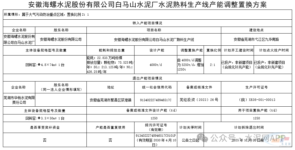 根據(jù)《水泥玻璃行業(yè)產(chǎn)能置換實施辦法(2024年本)》等文件要求,安徽海螺水泥股份有限公司白馬山水泥廠1條4000t/d水泥熟料生產(chǎn)線通過補產(chǎn)能方式將產(chǎn)能增加到5250t/d,置換產(chǎn)能來自蕪湖市華楊水泥有限責(zé)任公司、蕪湖瑞信水泥有限公司,置換比例為2:1。