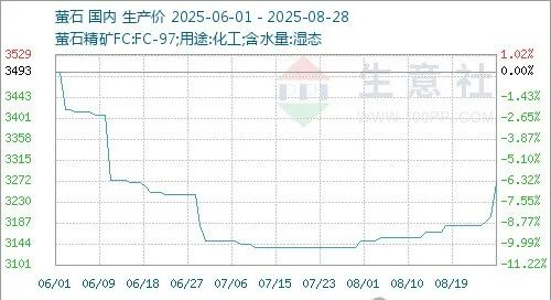 8月份國(guó)內(nèi)螢石價(jià)格走勢(shì)上漲,截止月末國(guó)內(nèi)螢石均價(jià)為3268.75元/噸,較月初價(jià)格3150元/噸上漲3.77%,同比下滑7.62%。