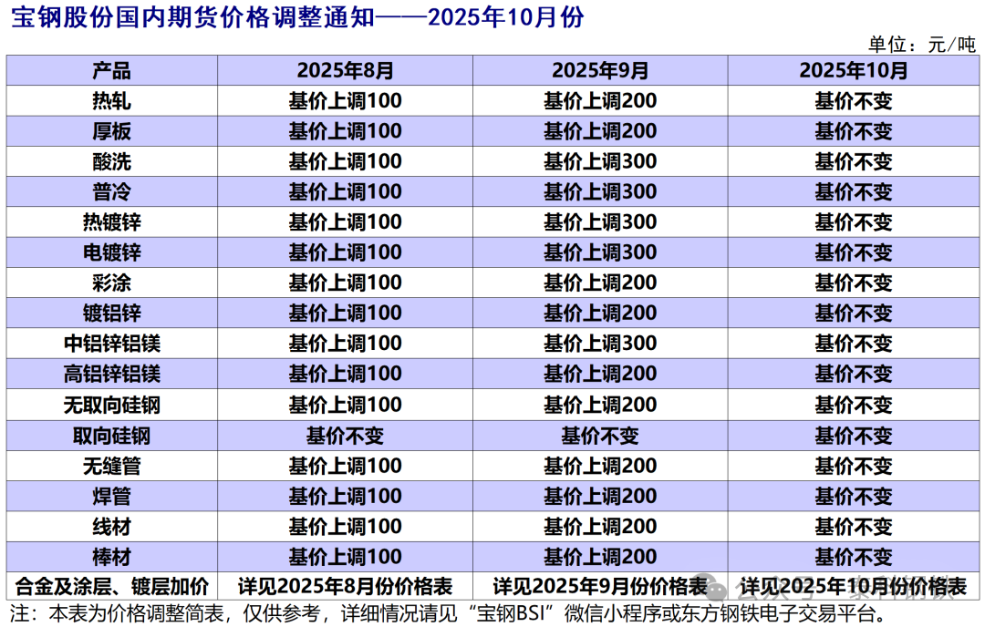 經(jīng)研究決定,寶鋼股份內(nèi)銷價格2025年10月份在9月份基礎(chǔ)上調(diào)整公告如下(以下除特殊注明外,均為不含稅):