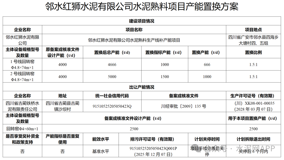 公示顯示,鄰水紅獅水泥1#4000t/d熟料線補(bǔ)充產(chǎn)能666t/d,補(bǔ)充后產(chǎn)能為4666t/d,2#4000t/d熟料線補(bǔ)充產(chǎn)能1000t/d,補(bǔ)充后產(chǎn)能為5000t/d,出讓產(chǎn)能來(lái)自四川省古藺鐵橋水泥有限責(zé)任公司一條2500t/d熟料線,置換比例1.5:1。