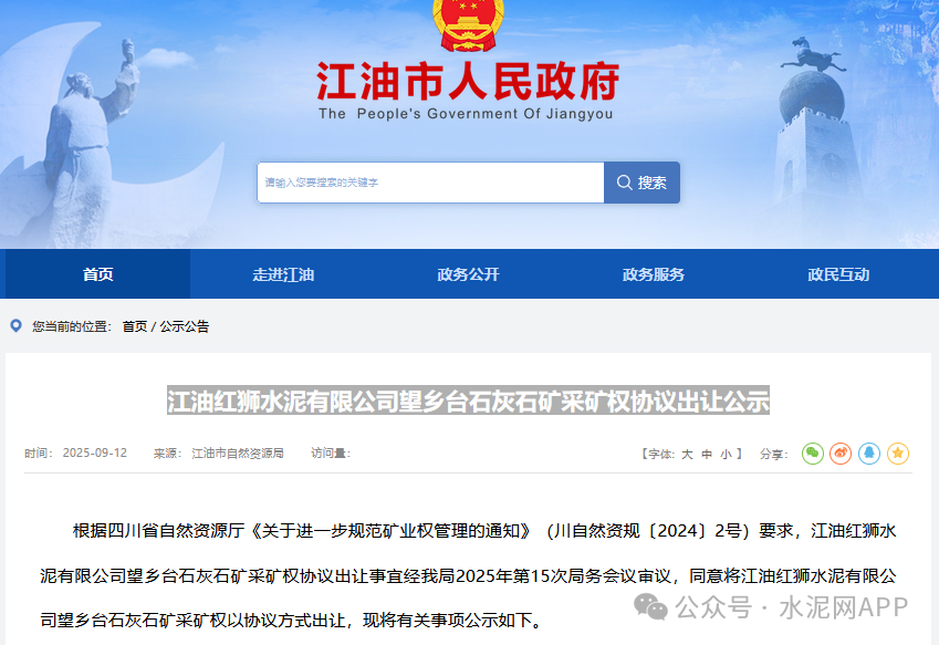 9月12日,四川省江油市人民政府發(fā)布“江油紅獅水泥有限公司望鄉(xiāng)臺(tái)石灰石礦采礦權(quán)協(xié)議出讓公示”。