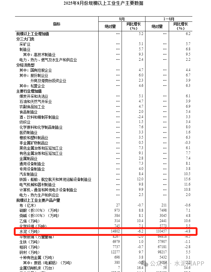 據(jù)國(guó)家統(tǒng)計(jì)局?jǐn)?shù)據(jù),8月份,規(guī)模以上工業(yè)增加值同比實(shí)際增長(zhǎng)5.2%(增加值增速均為扣除價(jià)格因素的實(shí)際增長(zhǎng)率)。從環(huán)比看,8月份,規(guī)模以上工業(yè)增加值比上月增長(zhǎng)0.37%。1—8月份,規(guī)模以上工業(yè)增加值同比增長(zhǎng)6.2%。其中水泥行業(yè)8月份全國(guó)水泥產(chǎn)量14802萬噸,同比下降6.2%;1-8月全國(guó)水泥產(chǎn)量110457萬噸,同比下降4.8%。此外,數(shù)據(jù)顯示,2024年1-8月全國(guó)水泥產(chǎn)量為115907萬噸,由此計(jì)算,今年1-8月水泥全口徑產(chǎn)量比去年同期減少5450萬噸,降幅4.7%。