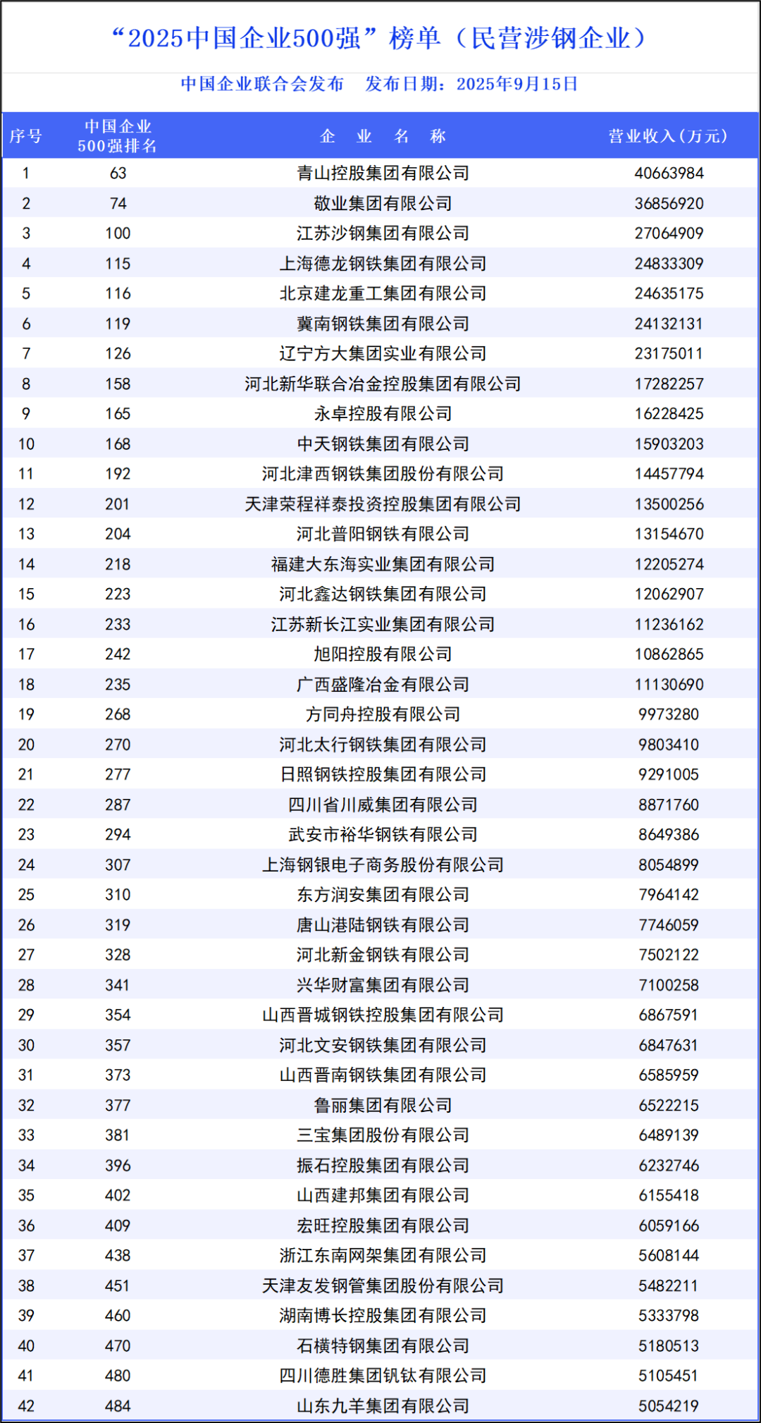 9月15日,中國企業(yè)聯合會發(fā)布了“2025中國企業(yè)500強”榜單。這是中國企聯連續(xù)第24次向社會發(fā)布該榜單。其中42家民營涉鋼企業(yè)上榜“2025中國企業(yè)500強”。排在“2025中國企業(yè)500強”前十位的民營鋼鐵企業(yè)有:青山控股集團有限公司,敬業(yè)集團有限公司,江蘇沙鋼集團有限公司,上海德龍鋼鐵集團有限公司,北京建龍重工集團有限公司,冀南鋼鐵集團有限公司,遼寧方大集團實業(yè)有限公司,河北新華聯合冶金控股集團有限公司,永卓控股有限公司,中天鋼鐵集團有限公司。