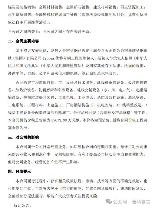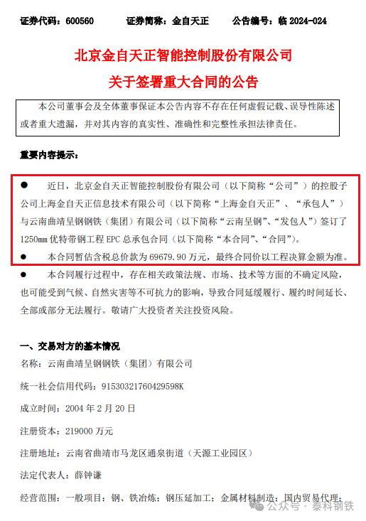 金自天正7月17日公告稱,其控股子公司上海金自天正信息技術有限公司與云南曲靖呈鋼鋼鐵(集團)有限公司簽訂了1250mm優(yōu)特帶鋼工程EPC總承包合同。本合同暫估含稅總價款為69679.90萬元,最終合同價以工程決算金額為準。合同履行過程中,存在相關政策法規(guī)、市場、技術等方面的不確定風險,也可能受到氣候、自然災害等不可抗力的影響。合同約定工程范圍包括:工廠設計及技術服務、軋線機電液設備、板坯連鑄設備、加熱爐設備等工作。本次合同簽訂屬于公司日常經(jīng)營業(yè)務,預計可對公司未來的營業(yè)收入和利潤產(chǎn)生一定積極影響。