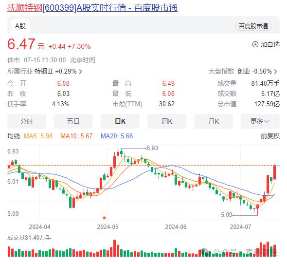 7月15日,撫順特鋼盤中漲幅達(dá)7.3%,截至11點(diǎn)30分,報(bào)6.47元。撫順特鋼近6個(gè)交易日股票已大漲27%。