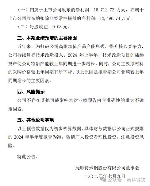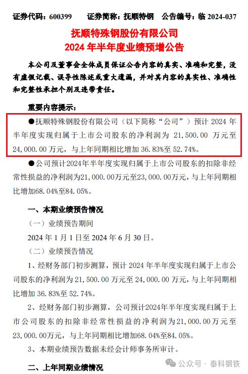 此前,撫順特鋼披露2024年半年度業(yè)績(jī)預(yù)增公告,該公司預(yù)計(jì)報(bào)告期歸屬于上市公司股東的凈利潤為2.15億元至2.4億元,與上年同期相比增加36.83%至52.74%。歸屬于上市公司股東的扣除非經(jīng)常性損益的凈利潤為2.1億元至2.3億元,與上年同期相比增加68.04%至84.05%。