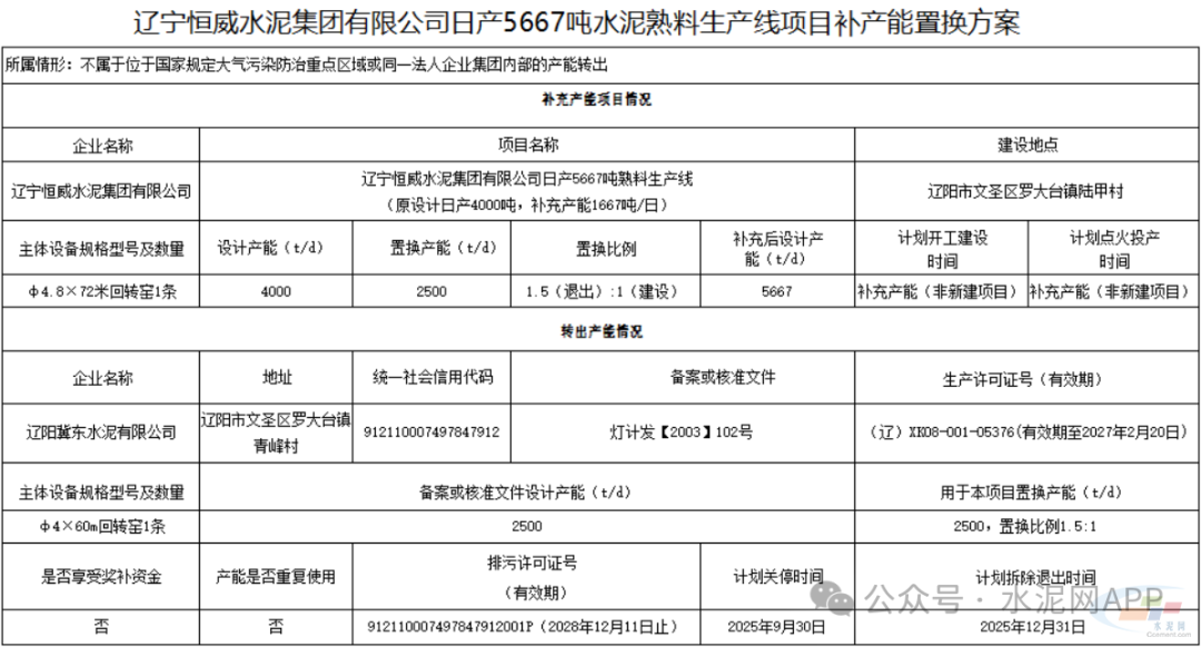 置換方案顯示,遼寧恒威水泥4000t/d熟料生產(chǎn)線補(bǔ)充產(chǎn)能1667t/d,補(bǔ)充后產(chǎn)能為5667t/d,退出產(chǎn)能來自遼陽冀東水泥一條2500t/d熟料生產(chǎn)線。