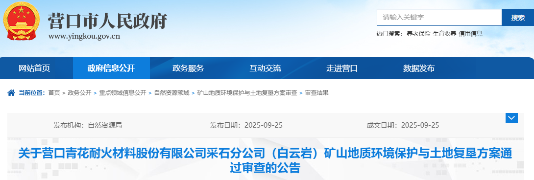 根據(jù)《國土資源部辦公廳關于做好礦山地質環(huán)境保護與土地復墾方案編報有關工作的通知》(國土資規(guī)〔2016〕21號)和《轉發(fā)國土資源部辦公廳關于做好礦山地質環(huán)境保護與土地復墾方案編報有關工作的通知》(遼國土資辦發(fā)〔2017〕88號)有關要求,營口青花耐火材料股份有限公司采石分公司(白云巖)礦山地質環(huán)境保護與土地復墾方案通過審查,現(xiàn)予公告。