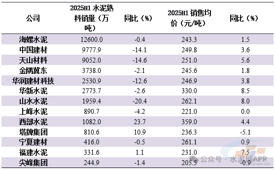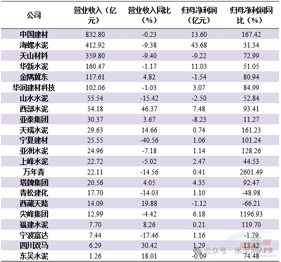 表1:2025年上半年水泥上市公司營收、利潤情況