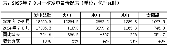 ★新能源替代效應(yīng)大為增強七、八月份,與火電裝機容量基本相當(dāng)?shù)男履茉闯隽φ?dāng)時,風(fēng)電、太陽能發(fā)電等新能源裝機的新增發(fā)電量不僅彌補了水電下降帶來的供應(yīng)缺口,還在很大程度上滿足了全社會用電量增長的需求(同比增長3.7%)。這從國家統(tǒng)計局發(fā)布的一次發(fā)電量情況表中可以清楚的看出來。