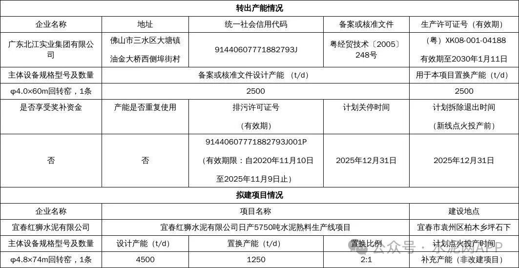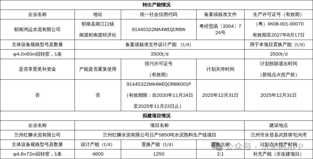 置換方案顯示,廣東北江實業(yè)集團轉出一條2500t/d熟料生產(chǎn)線,用于補充宜春紅獅水泥一條4500t/d熟料線,補充后產(chǎn)能為5750t/d。郁南鴻運水泥轉出一條2500t/d熟料生產(chǎn)線,用于補充蘭州紅獅水泥一條4600t/d熟料線,補充后產(chǎn)能為5850t/d。