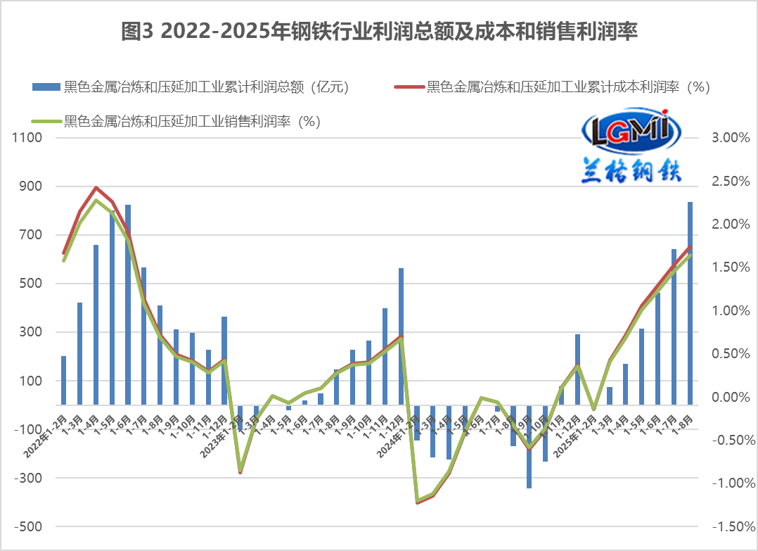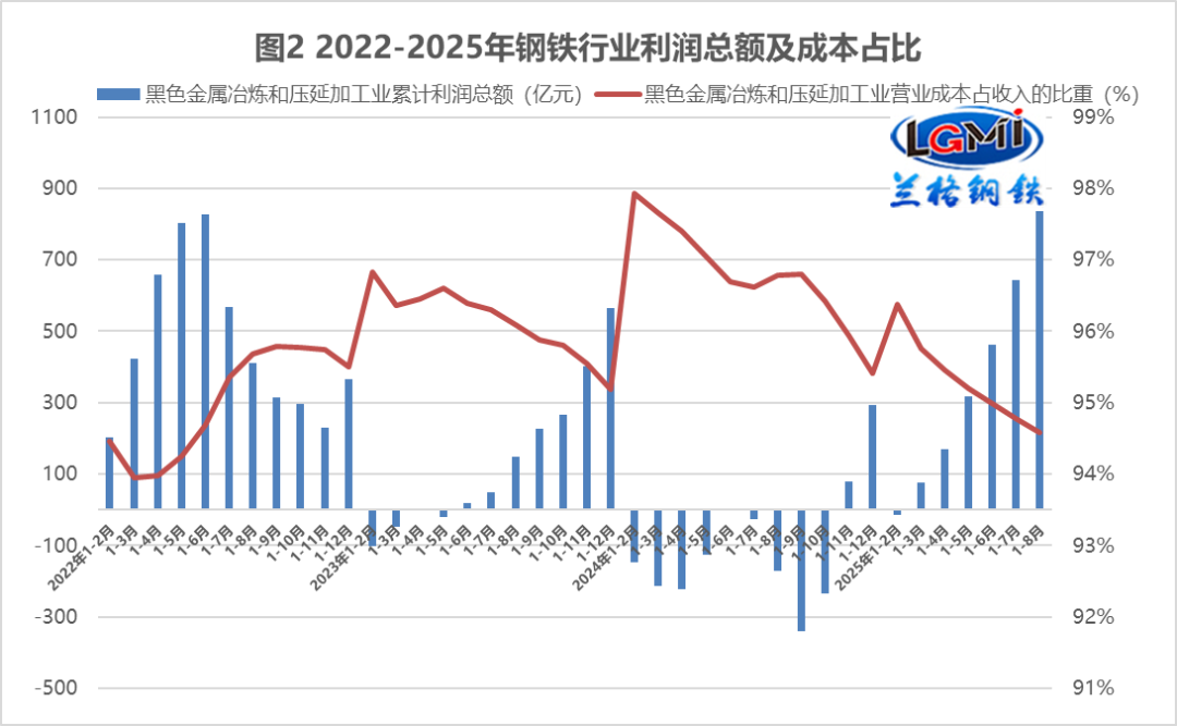 8月份,在經(jīng)濟(jì)運(yùn)行穩(wěn)中有進(jìn)、限產(chǎn)政策逐步落實(shí)、淡季效應(yīng)持續(xù)突顯、成本支撐維持韌性的影響下,國(guó)內(nèi)鋼鐵市場(chǎng)呈現(xiàn)了震蕩走弱的行情,但由于原料成本持續(xù)下降,使得鋼鐵行業(yè)的盈利空間持續(xù)擴(kuò)大。根據(jù)國(guó)家統(tǒng)計(jì)局發(fā)布數(shù)據(jù)顯示,2025年1-7月黑色金屬冶煉和壓延加工業(yè)盈利643.6億元,同比增長(zhǎng)5175.4%。從月度數(shù)據(jù)來(lái)看,1-2月鋼鐵行業(yè)虧損15.5億元,3月份鋼鐵行業(yè)盈利90.6億元,4月份鋼鐵行業(yè)盈利94.1億元,5月份鋼鐵行業(yè)盈利147.7億元,6月份鋼鐵行業(yè)盈利145.9億元,7月份鋼鐵行業(yè)盈利180.8億元,8月份鋼鐵行業(yè)盈利193.4億元,環(huán)比增加12.6億元。