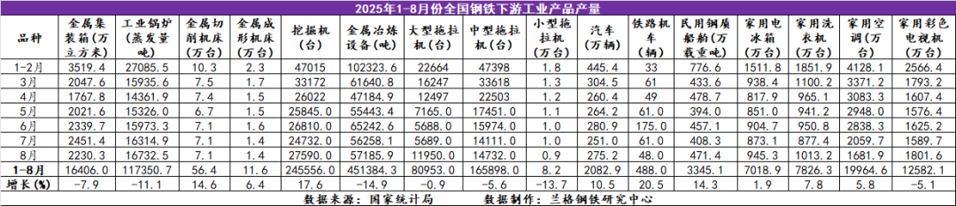 表2 2025年1-8月全國(guó)鋼鐵下游工業(yè)產(chǎn)品產(chǎn)量