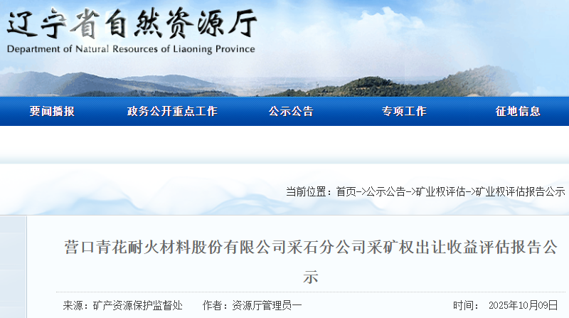 營口青花耐火材料股份有限公司采石分公司采礦權出讓收益評估報告通過遼寧省自然資源廳門戶網站向社會公示,公示10個工作日。如有異議,請于公示之日起10個工作日內以電話方式先向省自然資源廳礦產資源保護監(jiān)督處提出簡要意見,隨后及時將書面意見反饋到省自然資源廳礦產資源保護監(jiān)督處。