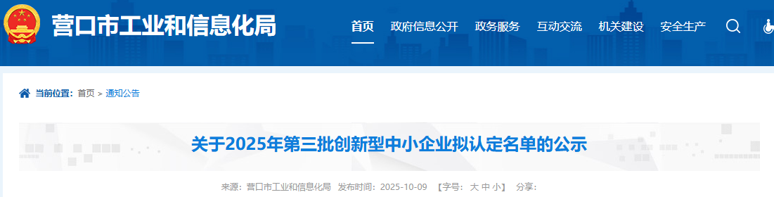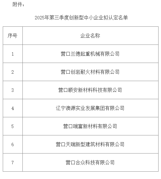 按省工信廳《關(guān)于做好2025年度創(chuàng)新型中小企業(yè)申報(bào)工作的通知》要求,經(jīng)企業(yè)登錄優(yōu)質(zhì)中小企業(yè)梯度培育平臺(tái)自愿申報(bào),各縣(市)區(qū)、園區(qū)工信主管部門推薦,營(yíng)口市工信局初審,擬認(rèn)定營(yíng)口創(chuàng)巖耐火材料有限公司等7家企業(yè)為2025年第三季度創(chuàng)新型中小企業(yè),現(xiàn)將通過名單予以公示。任何單位或個(gè)人對(duì)公示有異議的,可在公示期內(nèi)與市工信局聯(lián)系。