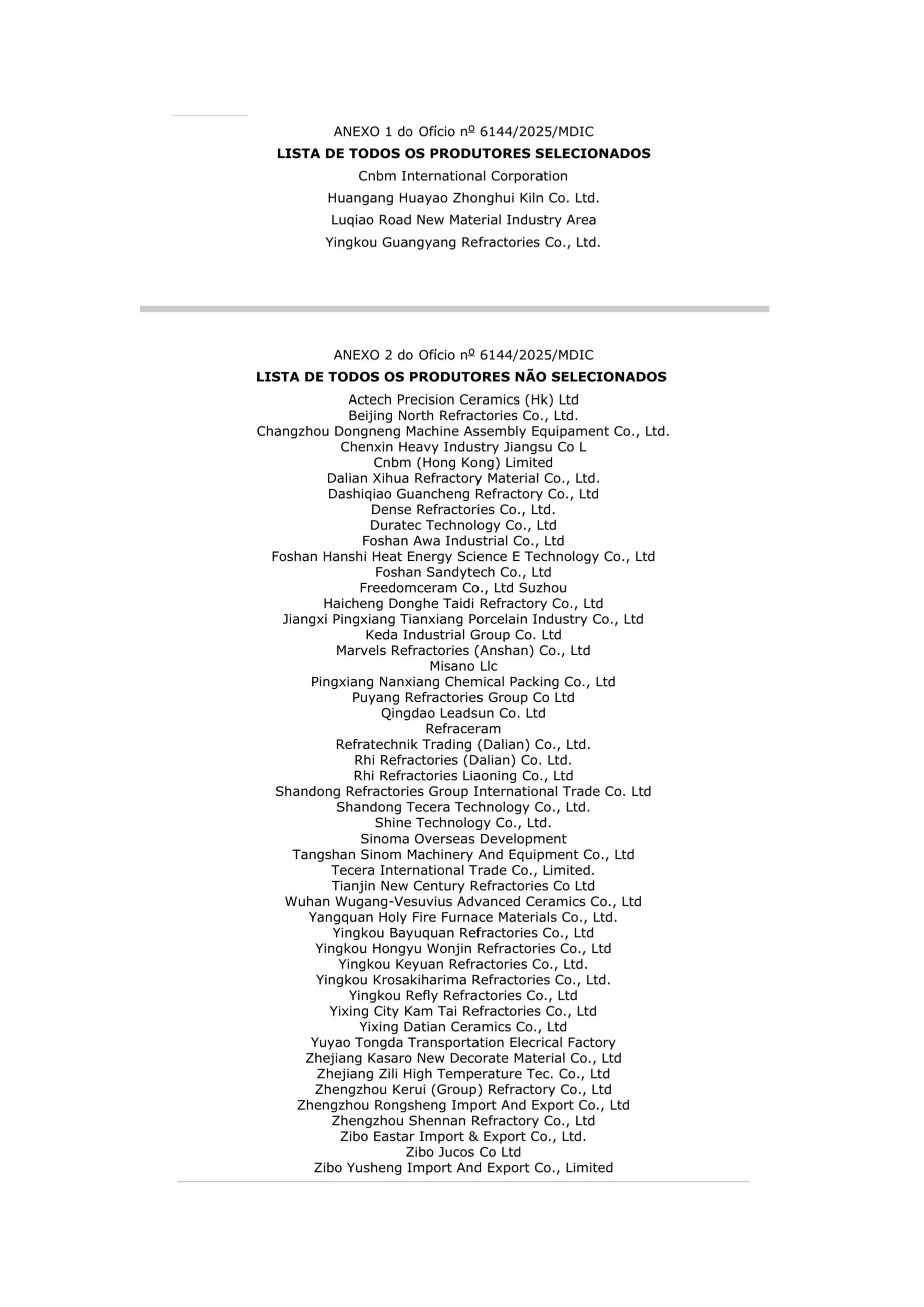 附件:耐火材料反傾銷案巴西調(diào)查機(jī)關(guān)抽樣名單