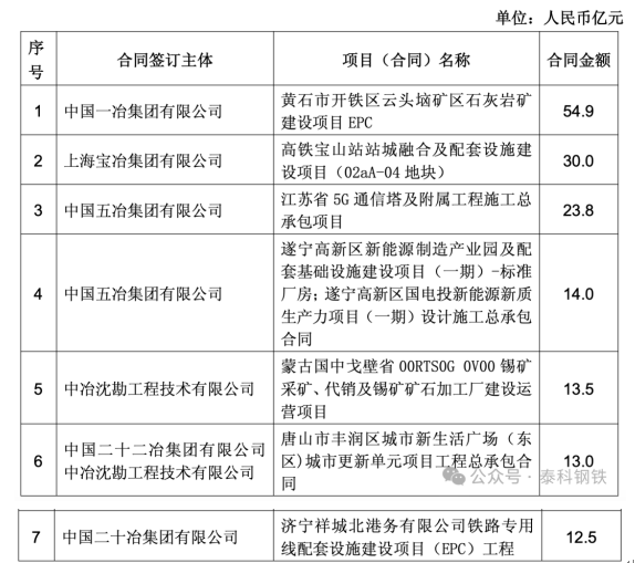 中國中冶7月新簽單筆合同額在人民幣10億元以上的重大工程承包合同項目: