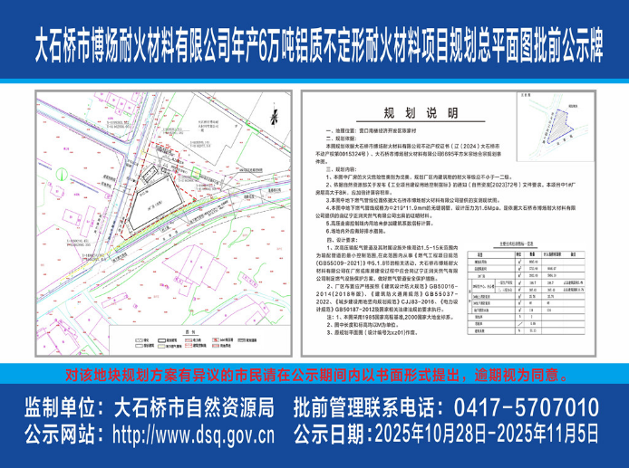 大石橋市博煬耐火材料有限公司年產(chǎn)6萬噸鋁質(zhì)不定形耐火材料項目規(guī)劃總平面圖批前公示 ?