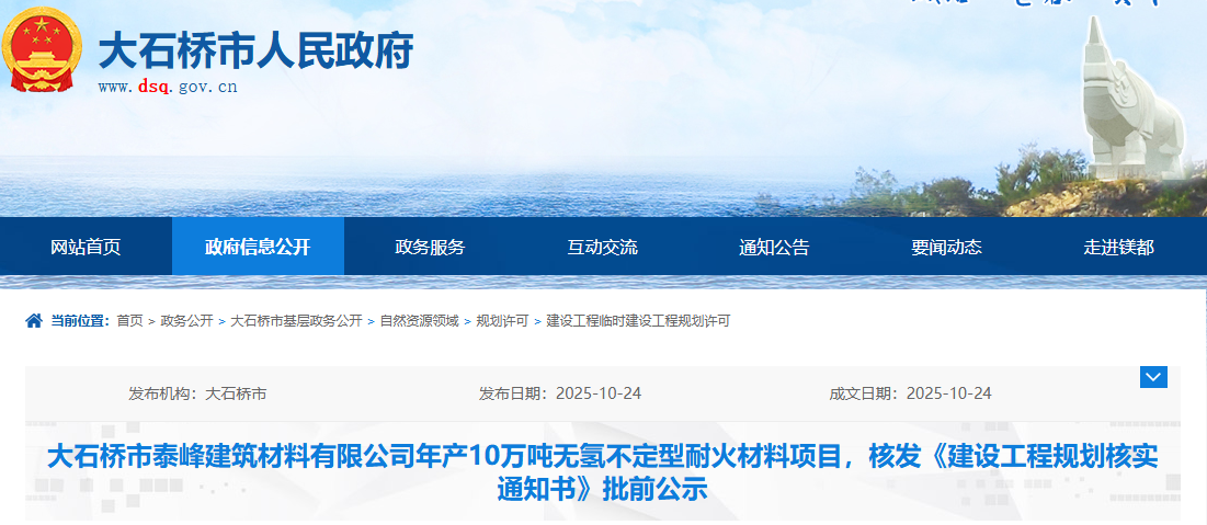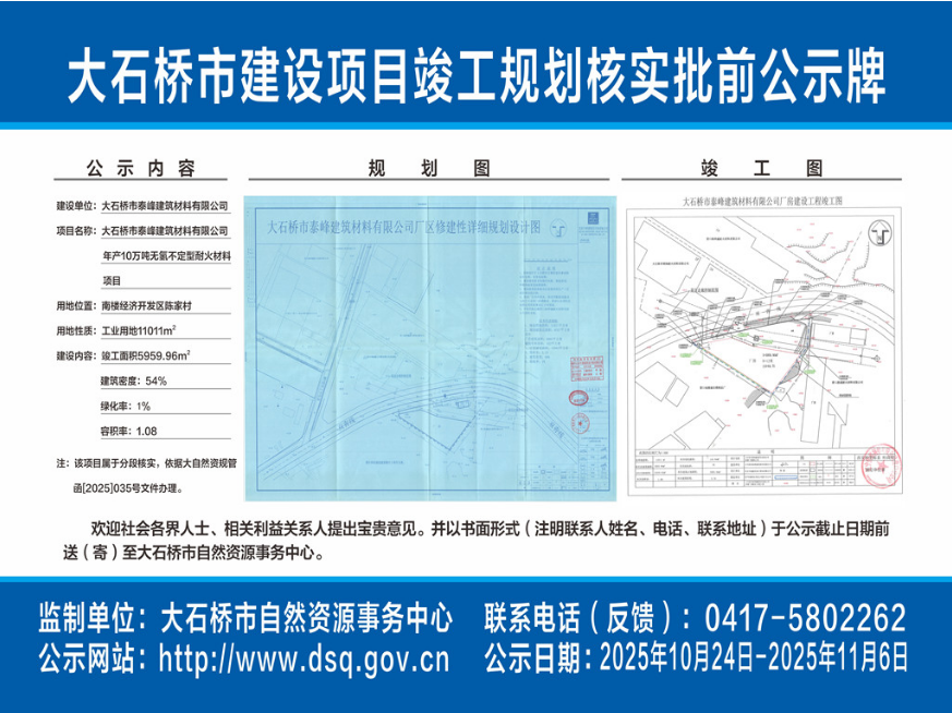 大石橋市泰峰建筑材料有限公司年產(chǎn)10萬噸無氫不定型耐火材料項目,核發(fā)《建設(shè)工程規(guī)劃核實通知書》批前公示