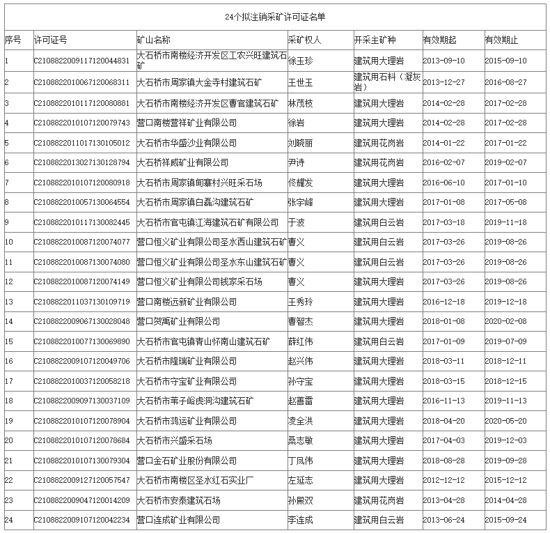 大石橋市南樓經(jīng)濟開發(fā)區(qū)工農(nóng)興旺建筑石礦等24個采礦許可證,礦業(yè)權(quán)人在有效期屆滿前未按規(guī)定申請辦理延續(xù)登記,采礦許可證已自行廢止。根據(jù)《礦產(chǎn)資源開采登記管理辦法》(國務(wù)院令第241號)和《自然資源部關(guān)于進一步完善礦產(chǎn)資源勘查開采登記管理的通知》(自然資規(guī)[2023]4號)第十八條,大石橋市自然資源局擬對上述采礦許可證予以注銷,現(xiàn)進行公示。