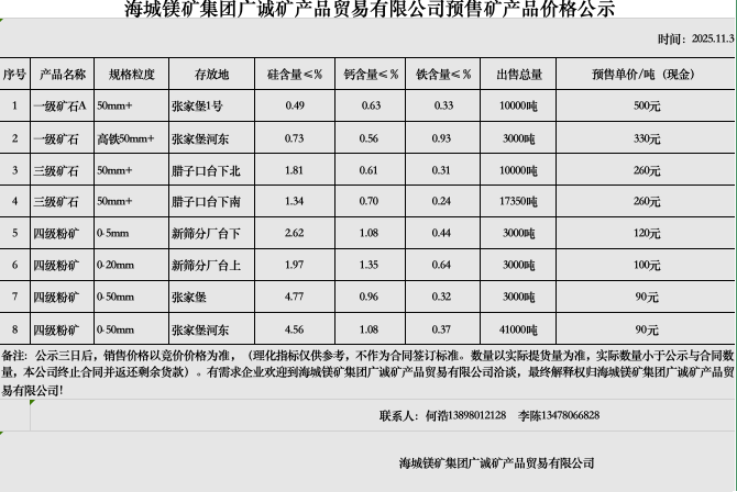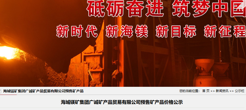海城鎂礦集團(tuán)廣誠礦產(chǎn)品貿(mào)易有限公司預(yù)售礦產(chǎn)品價(jià)格公示