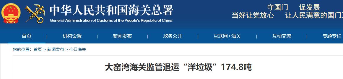 近日,在大連海關所屬大窯灣海關監(jiān)管下,174.8噸“洋垃圾”在大窯灣港碼頭裝船退運出境。