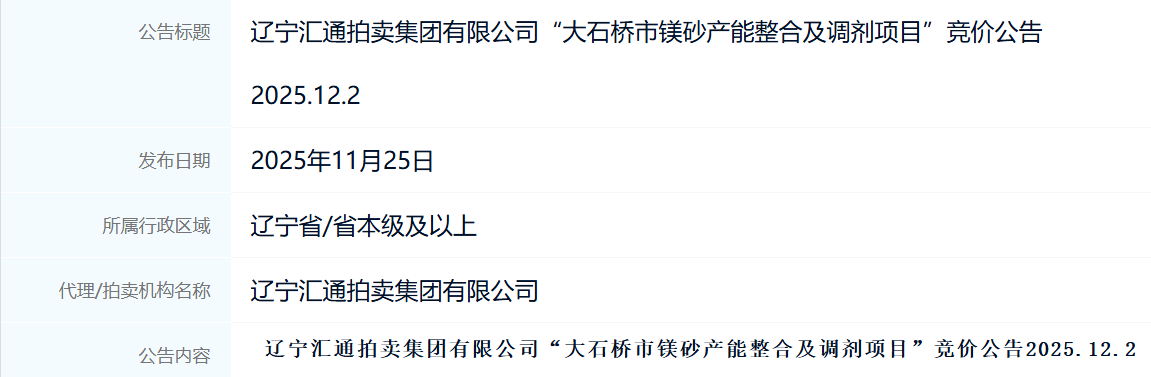 為貫徹落實大石橋市菱鎂產(chǎn)業(yè)結(jié)構(gòu)調(diào)整與轉(zhuǎn)型升級的戰(zhàn)略部署,優(yōu)化資源配置,實現(xiàn)高質(zhì)量發(fā)展。根據(jù)大石橋市鎂砂產(chǎn)能整合及調(diào)劑工作的總體安排,大石橋市政府責(zé)成大石橋市工業(yè)和信息化局委托遼寧匯通拍賣集團(tuán)有限公司,就已列入大石橋市850萬噸壓減目標(biāo)以及完成產(chǎn)能整合且已在大石橋市工業(yè)和信息化局報備的整合方企業(yè),擬于2025年12月2日組織公開競價活動,以確定產(chǎn)能整合及調(diào)劑的受讓方及補(bǔ)償金額。