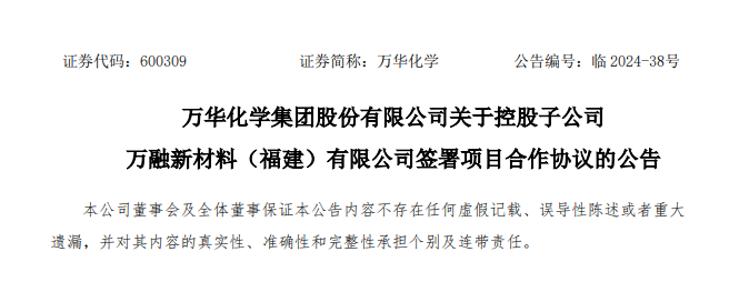 萬(wàn)華化學(xué)7月23日晚間公告,其控股子公司萬(wàn)融新材料(福建)有限公司(萬(wàn)融新材料)與阿布扎比國(guó)家石油公司(ADNOC)及其關(guān)聯(lián)公司北歐化工(Borealis)和博祿化學(xué)(Borouge)成功簽署《項(xiàng)目合作協(xié)議》。根據(jù)協(xié)議,四方將共同在福建省福州市建設(shè)一套特種聚烯烴一體化設(shè)施,開(kāi)展產(chǎn)能為160萬(wàn)噸/年的特種聚烯烴項(xiàng)目。