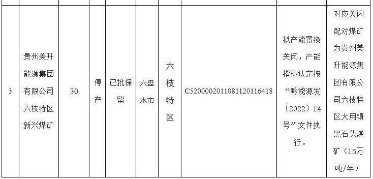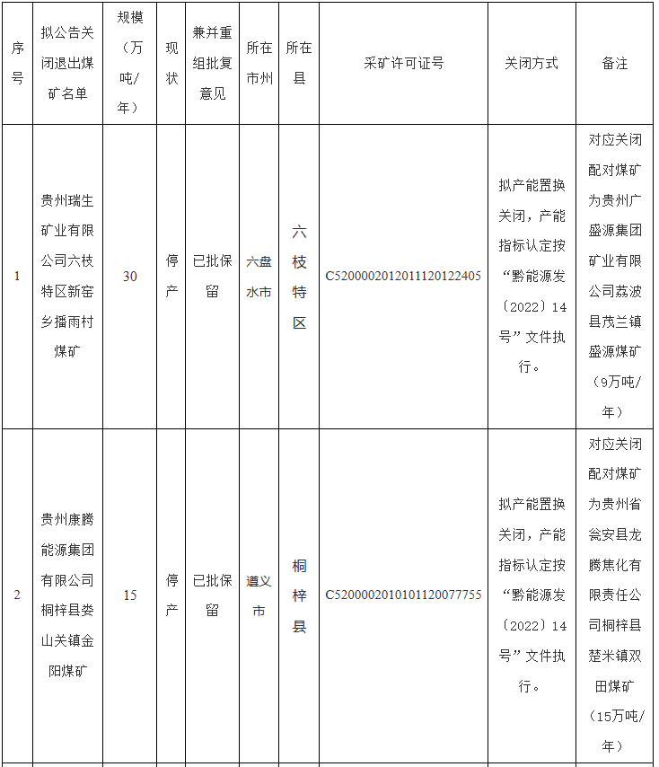 根據(jù)《國(guó)務(wù)院關(guān)于煤炭行業(yè)化解過(guò)剩產(chǎn)能實(shí)現(xiàn)脫困發(fā)展的意見(jiàn)》(國(guó)發(fā)〔2016〕7號(hào))、《關(guān)于加快推進(jìn)兼并重組煤礦分類(lèi)處置促進(jìn)煤炭產(chǎn)業(yè)轉(zhuǎn)型升級(jí)發(fā)展的通知》(黔能源煤炭〔2020〕100號(hào))、《省能源局關(guān)于進(jìn)一步做好煤炭產(chǎn)能置換工作的通知》(黔能源發(fā)〔2022〕14號(hào))等文件精神,依企業(yè)申請(qǐng),經(jīng)屬地政府同意,現(xiàn)按程序?qū)?jīng)煤礦主體企業(yè)申請(qǐng)的2024年第五批(前四批以原省煤炭產(chǎn)業(yè)結(jié)構(gòu)戰(zhàn)略性調(diào)整工作領(lǐng)導(dǎo)小組辦公室名義公示)擬關(guān)閉煤礦名單進(jìn)行公示(見(jiàn)下表),公示時(shí)間:2024年7月24日至2024年7月31日,凡對(duì)公示內(nèi)容有異議者,請(qǐng)?jiān)诠酒趦?nèi)以書(shū)面形式向省能源局反映(聯(lián)系電話(huà):0851—86891303)。