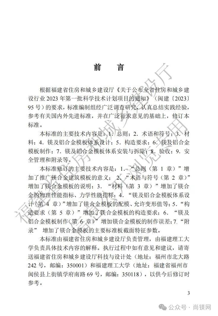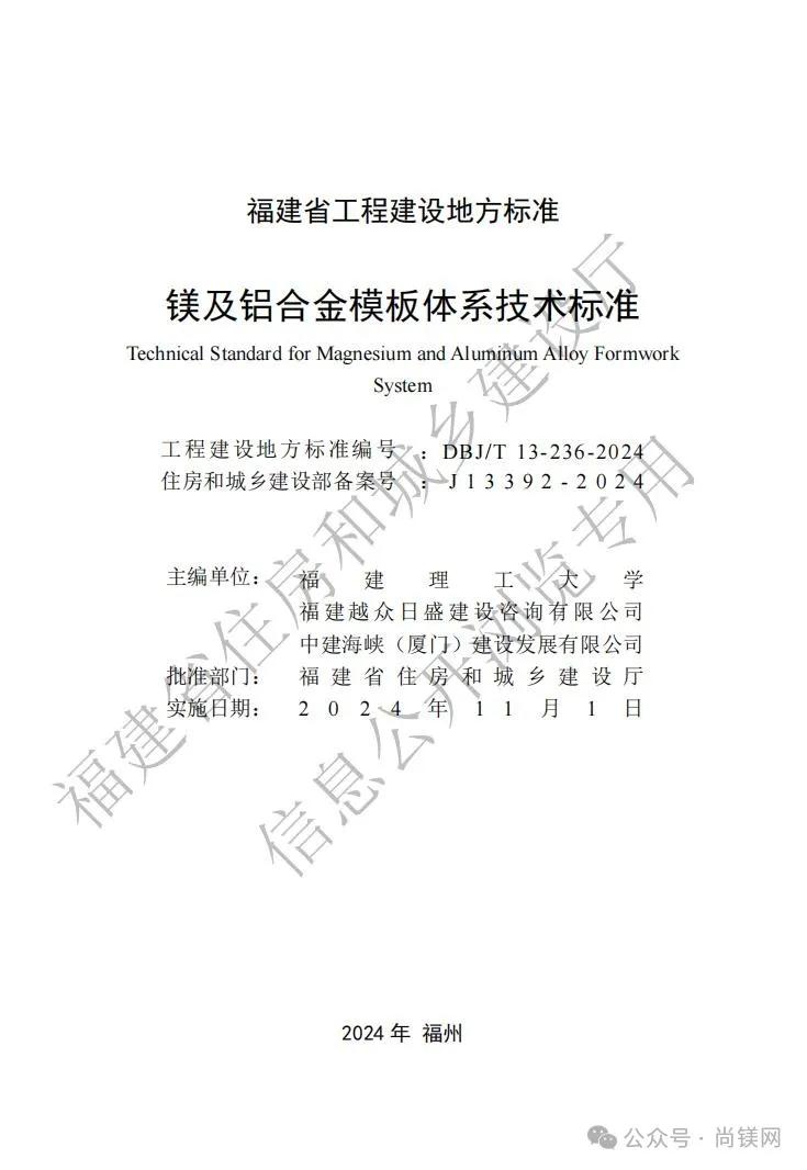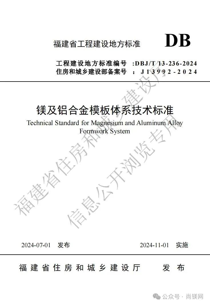 7月1日,福建省住房和城鄉(xiāng)建設(shè)廳發(fā)布《鎂及鋁合金模板體系技術(shù)標(biāo)準(zhǔn)》。該標(biāo)準(zhǔn)由由福建理工大學(xué)、福建越眾日盛建設(shè)咨詢有限公司、中建海峽(廈門)建設(shè)發(fā)展有限公司共同編制的,經(jīng)組織審查,批準(zhǔn)為福建省工程建設(shè)地方標(biāo)準(zhǔn),編號DBJ/T 13-236-2024,自2024年11月1日起實施,原《鋁合金模板體系技術(shù)標(biāo)準(zhǔn)》DBJ/T 13-236-2021同時廢止。