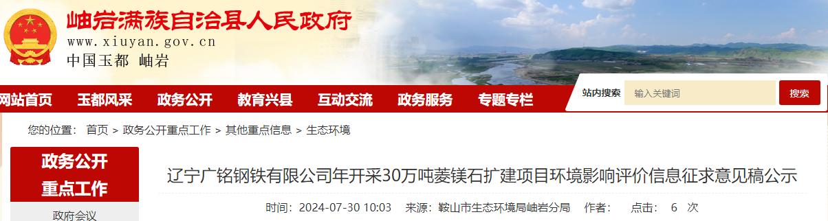 遼寧廣銘鋼鐵有限公司年開采30萬(wàn)噸菱鎂石擴(kuò)建項(xiàng)目已委托沈陽(yáng)東環(huán)環(huán)境咨詢有限公司開展環(huán)境影響評(píng)價(jià)工作,現(xiàn)按照《環(huán)境影響評(píng)價(jià)公眾參與辦法》(生態(tài)環(huán)境部令 第4號(hào))等法律法規(guī)文件要求,對(duì)該項(xiàng)目建設(shè)基本情況及公眾參與形式等信息公告如下,望廣大公眾積極參與,對(duì)項(xiàng)目的建設(shè)提出寶貴意見。
