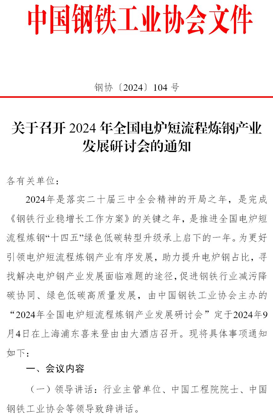 關(guān)于召開2024年全國(guó)電爐短流程煉鋼產(chǎn)業(yè)發(fā)展研討會(huì)的通知