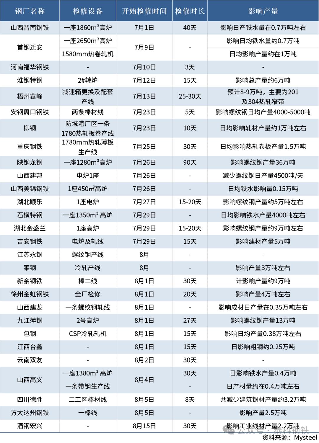 據(jù)不完全統(tǒng)計(jì),截至8月1日,國(guó)內(nèi)28家鋼廠發(fā)布檢修信息。其中,包鋼計(jì)劃于8月1日對(duì)CSP冷軋軋機(jī)進(jìn)行停產(chǎn)檢修,預(yù)計(jì)檢修15天,影響日均產(chǎn)量0.38萬(wàn)噸左右。