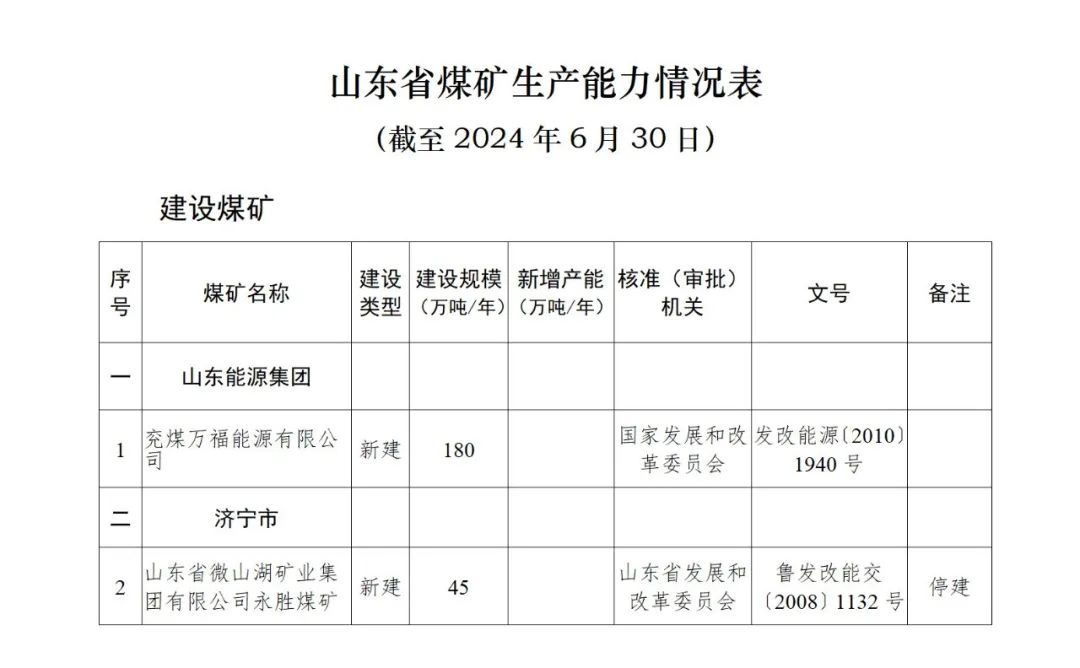 截至2024年6月30日,山東省有依法生產(chǎn)建設(shè)煤礦84處,產(chǎn)能規(guī)模12163萬噸/年。其中,建設(shè)煤礦2處,建設(shè)規(guī)模225萬噸/年;生產(chǎn)煤礦82處,登記生產(chǎn)能力11938萬噸/年。