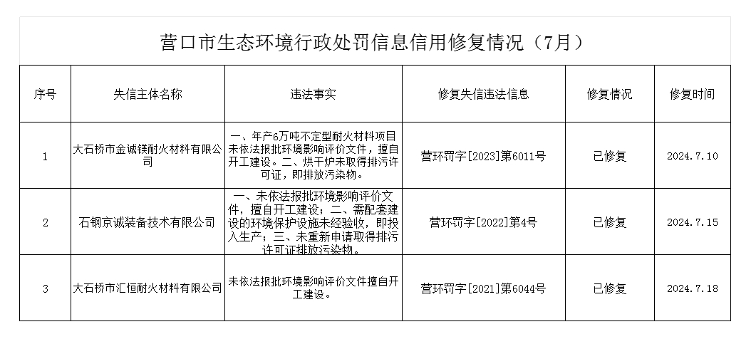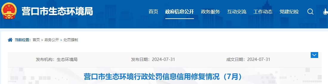 營口市生態(tài)環(huán)境行政處罰信息信用修復(fù)情況(7月)
