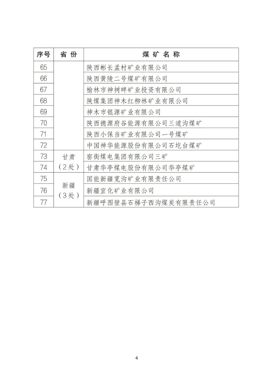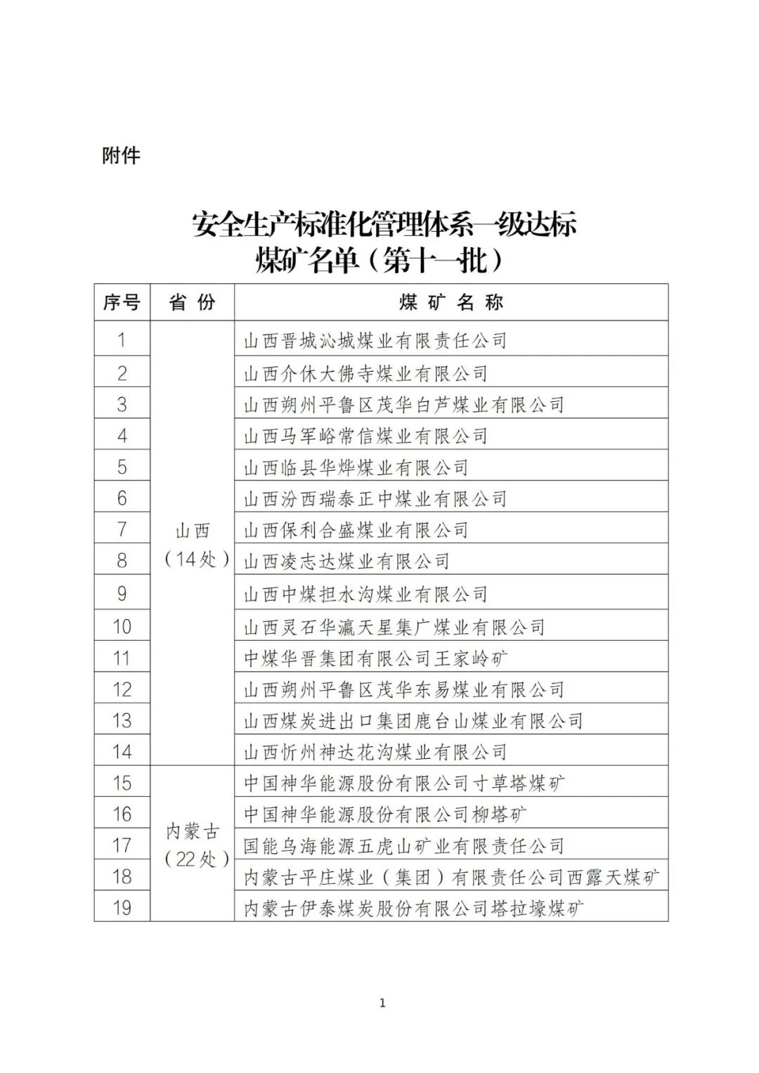礦安〔2024〕76號(hào)各產(chǎn)煤省、自治區(qū)及新疆生產(chǎn)建設(shè)兵團(tuán)煤礦安全監(jiān)管部門、煤炭行業(yè)管理部門,國(guó)家礦山安全監(jiān)察局各省級(jí)局,有關(guān)中央企業(yè):按照《煤礦安全生產(chǎn)標(biāo)準(zhǔn)化管理體系考核定級(jí)辦法(試行)》(煤安監(jiān)行管〔2020〕16號(hào))等規(guī)定,經(jīng)資料審查、現(xiàn)場(chǎng)檢查抽查、網(wǎng)上公示,確認(rèn)山西晉城沁城煤業(yè)有限責(zé)任公司等77處煤礦(詳見附件)為安全生產(chǎn)標(biāo)準(zhǔn)化管理體系一級(jí)達(dá)標(biāo)煤礦,現(xiàn)予以公布。自公布之日起生效,有效期3年,符合相關(guān)條件的,可申請(qǐng)自動(dòng)延期。根據(jù)《關(guān)于大力推進(jìn)煤礦安全生產(chǎn)標(biāo)準(zhǔn)化建設(shè)工作的通知》(安監(jiān)總煤行〔2017〕59號(hào))、《關(guān)于進(jìn)一步完善煤炭產(chǎn)能置換政策加快優(yōu)質(zhì)產(chǎn)能釋放促進(jìn)落后產(chǎn)能有序退出的通知》(發(fā)改辦能源〔2018〕151號(hào))、《關(guān)于印發(fā)煤礦生產(chǎn)能力管理辦法和核定標(biāo)準(zhǔn)的通知》(應(yīng)急〔2021〕30號(hào))等有關(guān)規(guī)定,上述77處煤礦在安全生產(chǎn)標(biāo)準(zhǔn)化管理體系一級(jí)等級(jí)有效期內(nèi)享受以下激勵(lì)政策:一、在全國(guó)性或區(qū)域性調(diào)整、實(shí)施減量化生產(chǎn)措施時(shí),原則上不納入減量化生產(chǎn)煤礦范圍。二、在地方政府因其他煤礦發(fā)生事故采取區(qū)域政策性停產(chǎn)措施時(shí),原則上不納入停產(chǎn)范圍。三、申請(qǐng)生產(chǎn)能力核增時(shí),在同等條件下,可優(yōu)先開展審查確認(rèn)工作;新投產(chǎn)的煤礦和已核定生產(chǎn)能力的煤礦,通過(guò)生產(chǎn)能力核定提高產(chǎn)能規(guī)模的間隔時(shí)間,可按規(guī)定縮短。四、生產(chǎn)能力核增時(shí),產(chǎn)能置換比例不小于核增產(chǎn)能的100%,通過(guò)改擴(kuò)建、技術(shù)改造增加優(yōu)質(zhì)產(chǎn)能超過(guò)120萬(wàn)噸/年以上的,所需產(chǎn)能置換指標(biāo)折算比例可提高為200%。五、生產(chǎn)能力核增時(shí),核增幅度可在“不超過(guò)煤炭工業(yè)設(shè)計(jì)規(guī)范標(biāo)準(zhǔn)設(shè)計(jì)井型規(guī)模2級(jí)級(jí)差”規(guī)定的基礎(chǔ)上,上浮1級(jí)級(jí)差;實(shí)現(xiàn)“一井一面”或智能化開采的,核增幅度可上浮2級(jí)級(jí)差。六、在安全生產(chǎn)許可證有效期屆滿時(shí),符合相關(guān)條件的,可以直接辦理延期手續(xù)。七、銀行保險(xiǎn)、證券、擔(dān)保等主管部門作為對(duì)煤礦企業(yè)信用評(píng)級(jí)重要參考依據(jù)。八、各級(jí)煤礦安全監(jiān)管監(jiān)察部門適當(dāng)減少檢查頻次;煤礦停產(chǎn)后復(fù)產(chǎn)驗(yàn)收時(shí),優(yōu)先進(jìn)行復(fù)產(chǎn)驗(yàn)收。附件:安全生產(chǎn)標(biāo)準(zhǔn)化管理體系一級(jí)達(dá)標(biāo)煤礦名單(第十一批)