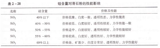 高品質(zhì)超微細(xì)滑石粉成片狀結(jié)構(gòu),用于塑料制品時(shí),作為增強(qiáng)、改性功能填料不但能節(jié)省樹脂的使用量,還能顯著提高產(chǎn)品的剛度、沖擊強(qiáng)度、彎曲模量和熱穩(wěn)定性?;劭删鶆虻某蓪盈B狀分散在樹脂中,與樹脂有較好的相容性和力學(xué)性能的互補(bǔ)性。如同水泥制品中嵌入的金屬結(jié)構(gòu)網(wǎng),能夠在保持塑料的自身優(yōu)點(diǎn)時(shí),形成力學(xué)性能優(yōu)異的增強(qiáng)支撐形態(tài),可提高塑料制品的物理性能,滑石粉的光散射作用還具有明顯的保溫、阻隔性能,在降低生產(chǎn)成本的同時(shí),可明顯改善塑料制品的力學(xué)性能和物理性能。決定工業(yè)滑石粉質(zhì)量的主要指標(biāo)要看滑石粉的純度、白度和細(xì)度。評價(jià)一種滑石產(chǎn)品的優(yōu)劣,僅以一個(gè)指標(biāo)判斷質(zhì)量是片面的和不確切的?;募兌仍礁?,其增強(qiáng)的效果越好。滑石中的其他礦物雜質(zhì),金屬類礦物(特別是鐵)對塑料的耐老化性有十分明顯的影響?;壑械墓?SiO2)含量是衡量滑石粉品位的重要指標(biāo),滑石粉中硅含量越高,滑石的純度越高,應(yīng)用效果也好,價(jià)格也越高。我們要根據(jù)不同的塑料制品性能要求來選擇滑石粉,如在農(nóng)用薄膜中使用高硅滑石粉,不但薄膜的透光率好、薄膜的拉伸強(qiáng)度、斷裂強(qiáng)度、抗穿刺性等指標(biāo)都有提高。而在注塑、板材、棒材中使用的滑石粉硅含量要求不高,硅成分較低的產(chǎn)品不但價(jià)格較低,同時(shí)還可改善塑料制品的硬度、沖擊強(qiáng)變等?;壑械腟iO2含量對滑石粉的性能影響可參見表。