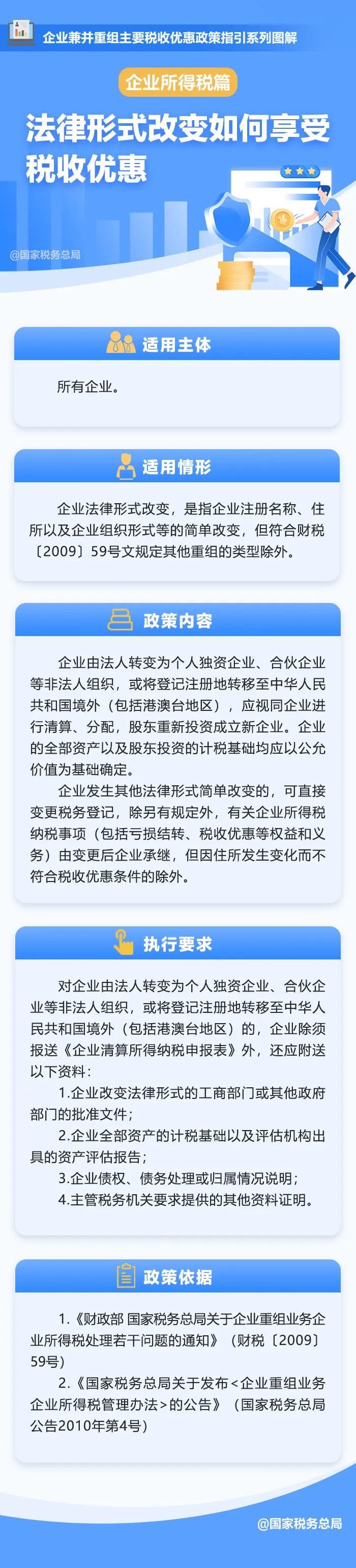 為引導(dǎo)企業(yè)正確適用兼并重組稅收政策,財(cái)政部、稅務(wù)總局等部門編寫了《企業(yè)兼并重組主要稅收優(yōu)惠政策指引》,對現(xiàn)行有效的支持企業(yè)兼并重組主要稅收優(yōu)惠政策和稅收征管文件進(jìn)行了梳理,并按照企業(yè)兼并重組的類型,分門別類明確了適用主體、適用情形、政策內(nèi)容、執(zhí)行要求及政策依據(jù)等內(nèi)容,為納稅人提供簡明易行、獲得感強(qiáng)的操作指南。今天學(xué)習(xí):企業(yè)兼并重組企業(yè)所得稅優(yōu)惠政策——法律形式改變?nèi)绾蜗硎芏愂諆?yōu)惠?