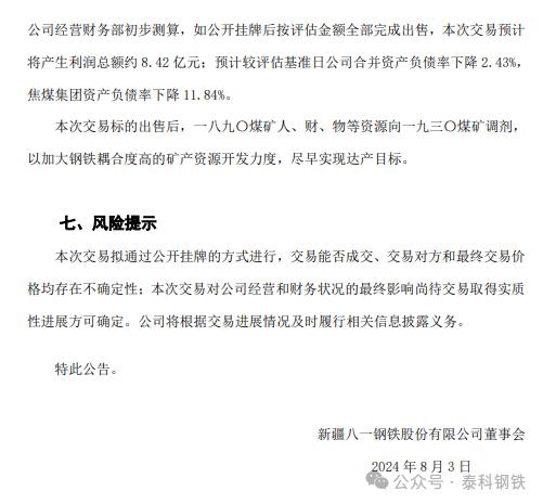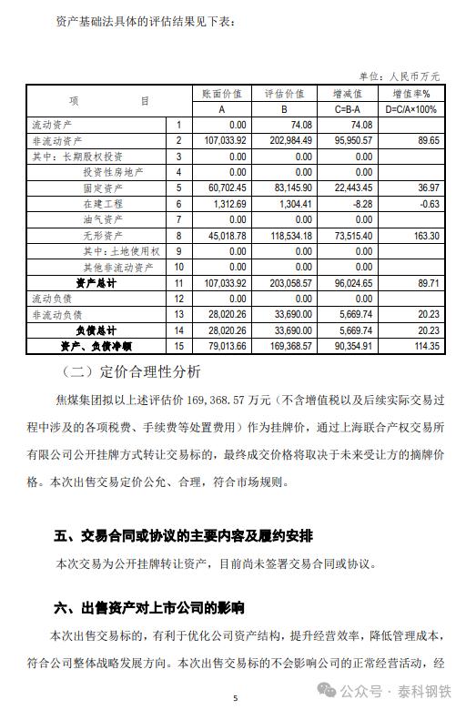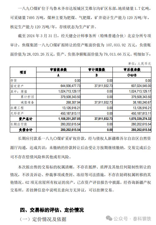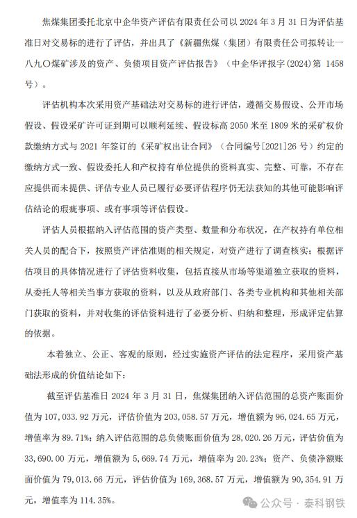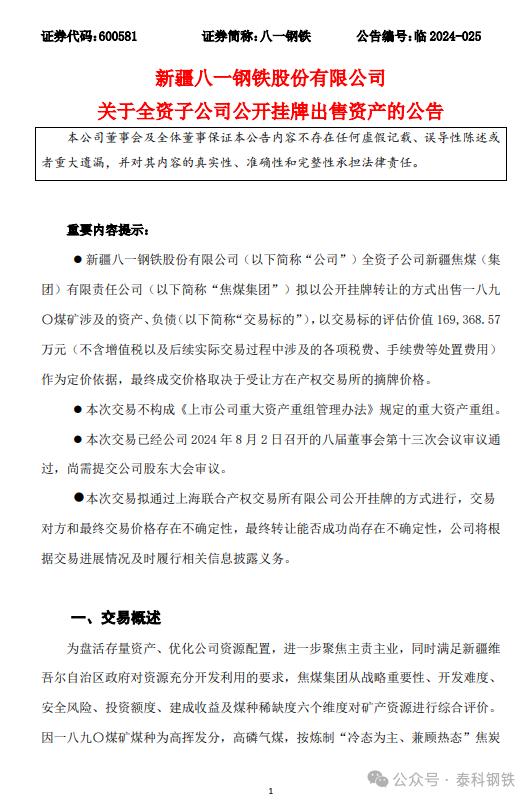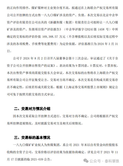中國(guó)寶武旗下八一鋼鐵8月2日晚間發(fā)布公告稱(chēng),為盤(pán)活存量資產(chǎn)、優(yōu)化公司資源配置,進(jìn)一步聚焦主責(zé)主業(yè),同時(shí)滿(mǎn)足新疆維吾爾自治區(qū)政府對(duì)資源充分開(kāi)發(fā)利用的要求,焦煤集團(tuán)從戰(zhàn)略重要性、開(kāi)發(fā)難度、安全風(fēng)險(xiǎn)、投資額度、建成收益及煤種稀缺度六個(gè)維度對(duì)礦產(chǎn)資源進(jìn)行綜合評(píng)價(jià)。因一八九〇煤礦煤種為高揮發(fā)分,高磷氣煤,按煉制“冷態(tài)為主、兼顧熱態(tài)”焦炭的正向作用排序,煤礦煤種對(duì)主業(yè)契合度不高。擬通過(guò)在上海聯(lián)合產(chǎn)權(quán)交易所有限公司公開(kāi)掛牌的方式出售一八九〇煤礦涉及的資產(chǎn)、負(fù)債。本次交易以北京中企華資產(chǎn)評(píng)估有限責(zé)任公司出具的《新疆焦煤(集團(tuán))有限責(zé)任公司擬轉(zhuǎn)讓一八九〇煤礦涉及的資產(chǎn)、負(fù)債項(xiàng)目資產(chǎn)評(píng)估報(bào)告》中所確定的交易標(biāo)的評(píng)估價(jià)值約16.94億元為定價(jià)依據(jù),評(píng)估基準(zhǔn)日為2024年3月31日。