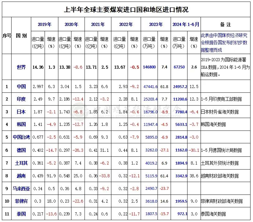 2024年上半年全球主要煤炭進(jìn)口國和地區(qū)進(jìn)口情況